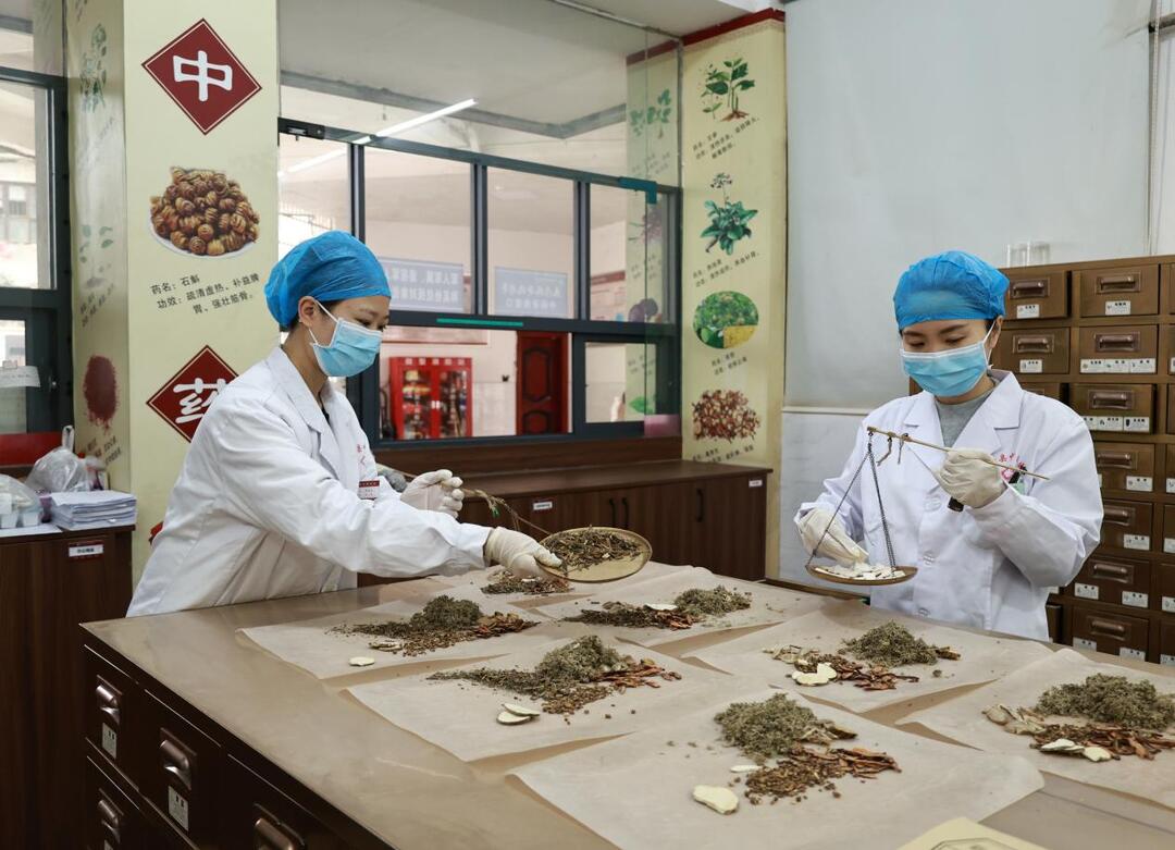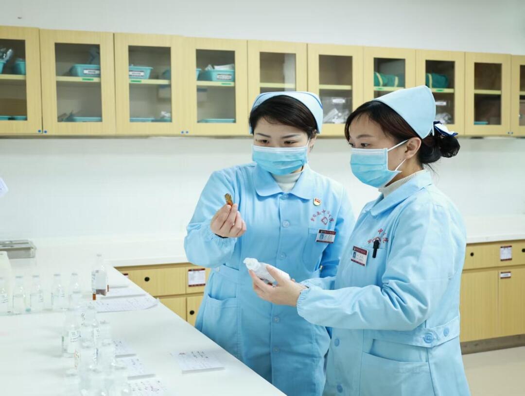 ▲图为新田县中医医院肿瘤科护士在核对输液药物。