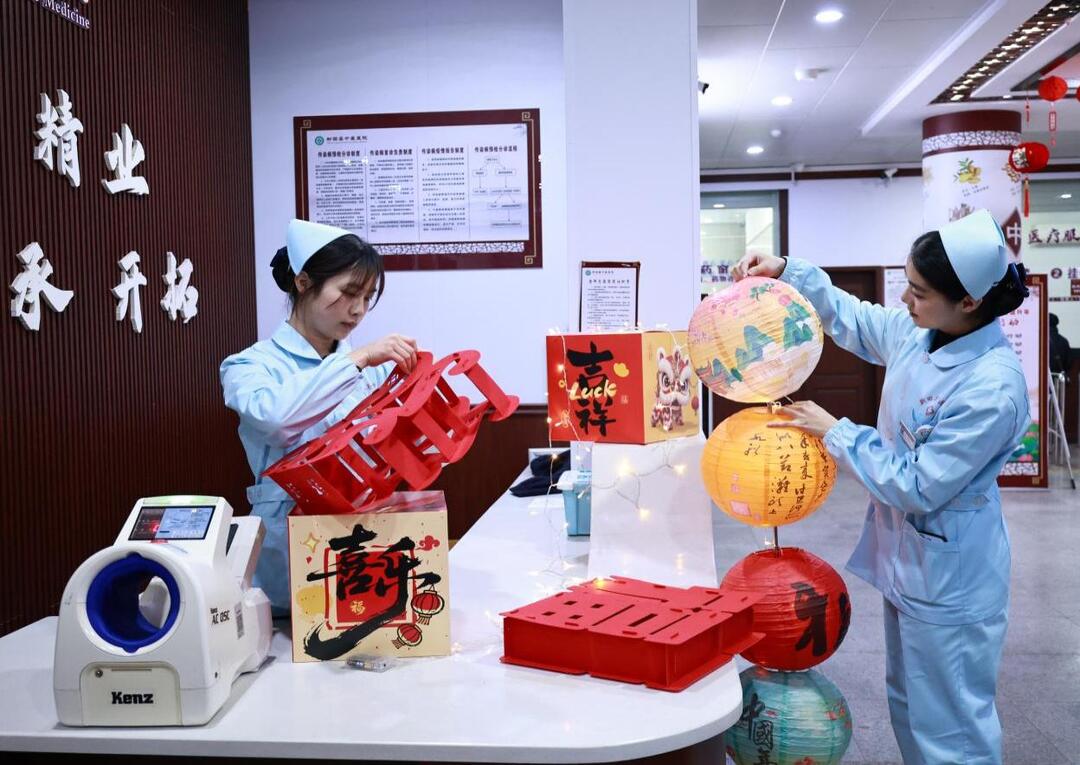 ▲图为除夕当天,新田县中医医院导诊台护士在精心装扮门诊大厅,营造温馨欢乐氛围。