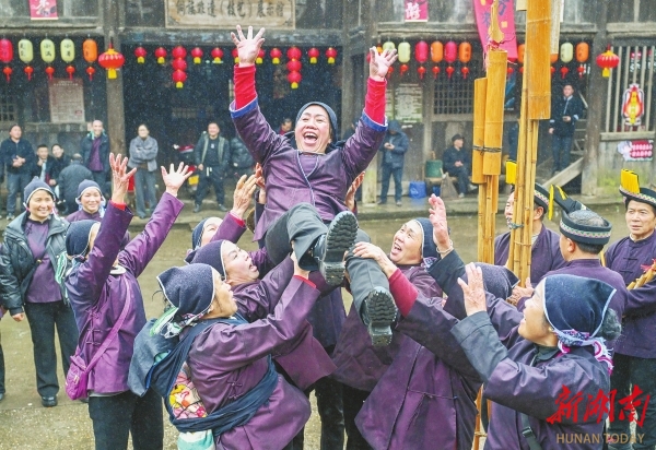 2月5日,芋头村村民身着侗族传统服饰,拿着工具模仿劳作等场景,欢乐闹新春。