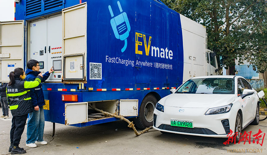 Since the start of the Spring Festival travel rush, traffic volume at the Anjiang Service Area along the G60 Shanghai-Kunming Expressway in Huaihua has been steadily increasing. To meet the growing charging needs of electric vehicles, local expressway authorities have expanded the service area's charging parking spaces to 16 and deployed mobile charging vehicles to enhance service capacity. The photo shows a mobile charging vehicle recharging a new energy vehicle that passes through the Anjiang Service Area along the G60 Shanghai-Kunming Expressway in Huaihua. (Photo/Tian Wenguo and Li Cuicai)