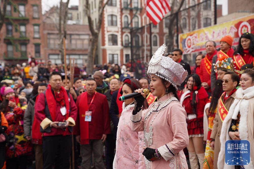 ↑2月17日,歌手在美国纽约中国城的庙会现场演唱歌曲。