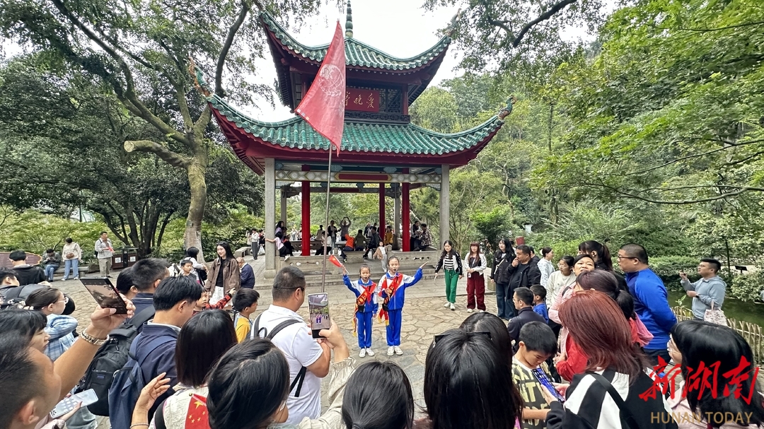 “大家看,爱晚亭始建于清乾隆五十七年……”在爱晚亭前,一位小讲解员流利的解说引得游客纷纷驻足。讲解结束后,一位年轻的小姐姐跑来要与她合照留念,并夸赞她:“小小年纪,就如此的自信和从容,能把历史讲得这么生动!”