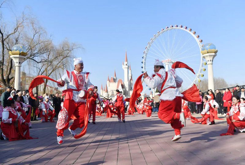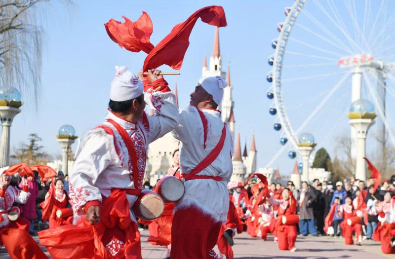 2月18日,大年初二,石景山游乐园,陕西的国家级非遗安塞腰鼓为游客表演。石景山游乐园2026“迎春庙会·新春灯火游园会”持续至3月8日。“迎春庙会”持续至2月23日,“新春灯火游园会”则以“日游园、夜赏灯”为主线,营造昼夜皆宜的游玩体验。