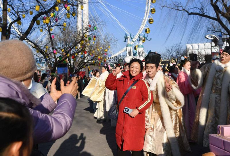 石景山游乐园春节双会活动集非遗表演、光影艺术、特色美食、趣味互动于一体,吸引众多游客。