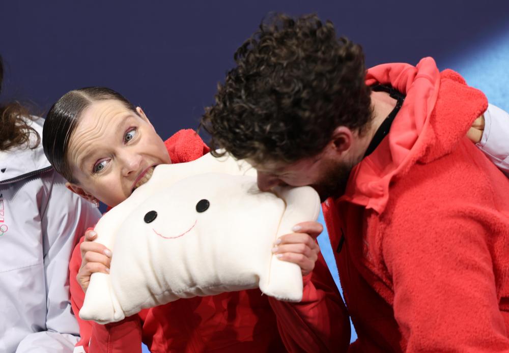 2月15日,波兰组合希特赫蒂尼娜/沃兹尼亚克(右)在花样滑冰双人滑短节目比赛后等待成绩。新华社记者 李明 摄