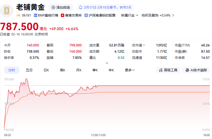 盘面上,截至2月16日收盘,老铺黄金股价报787.5港元/股,涨幅为6.64%,当前总市值为1392亿港元;2026年以来,老铺黄金已累计上涨约27%。