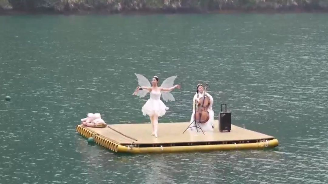 小东江1号站台前,一场别出心裁的艺术快闪正悄然上演——古典大提琴与水上芭蕾跨界融合,乐声婉转、舞姿翩翩,山水之间流淌着浪漫韵律。