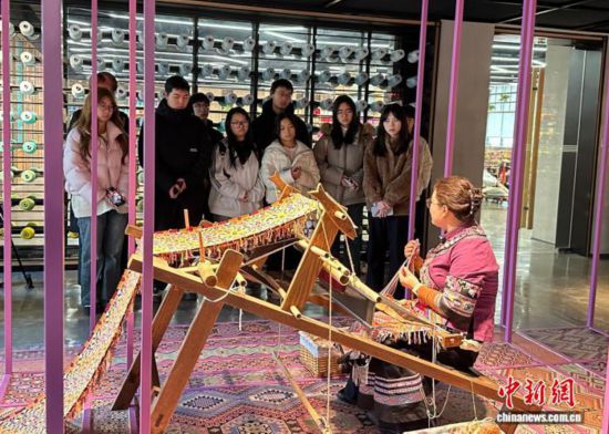 In an art museum filled with the rhythmic sound of looms, Zhang Tiantian, a recognized inheritor of Tujia brocade weaving, part of China's national intangible cultural heritage, patiently guided students through the craft's first step: straightening the warp threads.