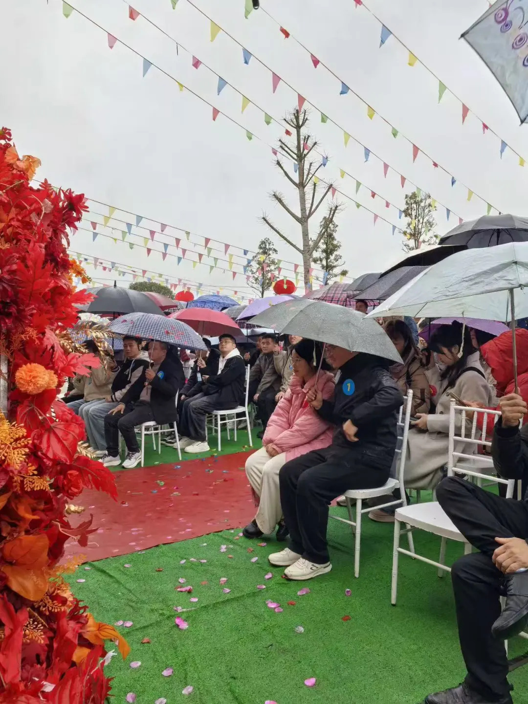19日,活动现场铺设红地毯,设置“爱情门”,循环播放《甜蜜蜜》《最浪漫的事》等背景音乐,台下坐着贴着号码牌的男女嘉宾,众多村民冒着雨前来围观。一对结婚50年的金婚夫妇和一对结婚25年的银婚夫妇分享他们的爱情故事,主持人打趣问道:“当年谁追的谁?”“吵架了怎么办?”