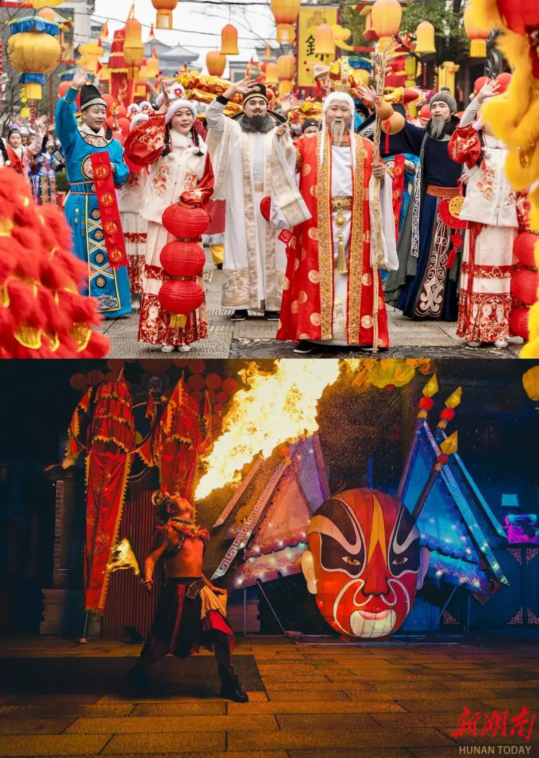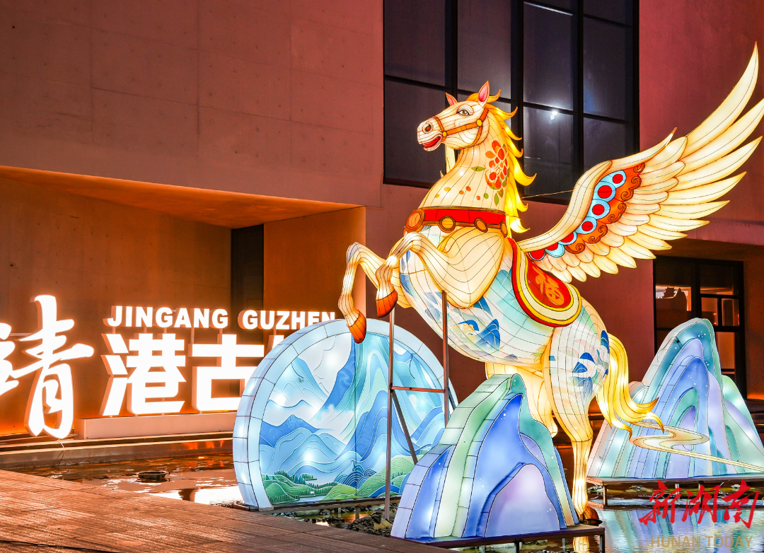 走进靖港古镇,浓浓的年味扑面而来。大型新春对联、吉祥福语、祈福财门装点街巷,千盏花灯高高挂起,打造长沙最长灯笼街,“马上有福”“马到功成”等马年主题灯组与湘绣、皮影、剪纸非遗灯彩交相辉映,一步一景皆是国风盛景。