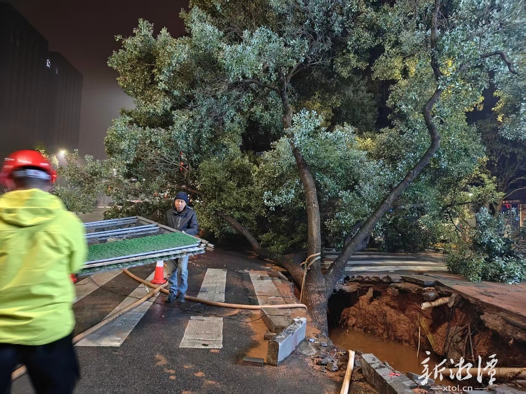 凌晨2时许,刚刚结束禁燃值守任务准备稍作休息的园林中心工作人员,突然接到值班调度室的紧急电话:河东大道金桂名城路口发生自来水爆管事故,巨大的水压导致路面塌陷,一棵胸径达40厘米的行道树轰然倒伏,造成交通堵塞,现场情况十分危急。