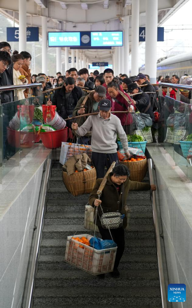 Villagers carrying goods for sale prepare to leave the Tongren Railway Station in Tongren City, southwest China's Guizhou Province, Feb. 12, 2026.The train No. 7272/7271 has run across the mountainous areas in Hunan, Guizhou and Chongqing for almost 20 years. With an average speed of just 40 kilometers per hour, the train has made it easier for residents along the route to travel and commute, while also helping local products reach wider markets. (Xinhua/Liu Xu)