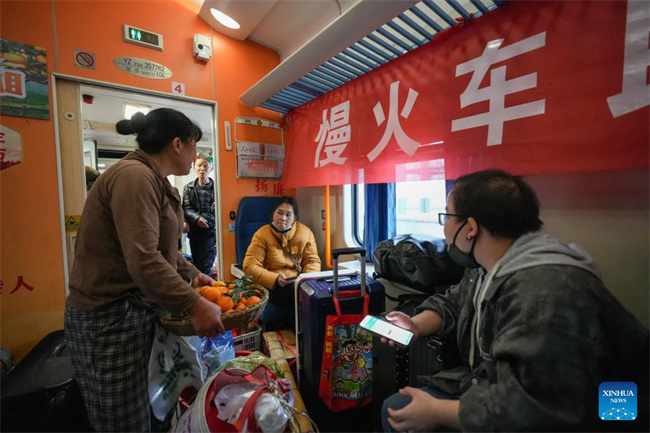 A villager (R) from Hunan Province sells fruits to passengers on the train No. 7272 on Feb. 12, 2026.The train No. 7272/7271 has run across the mountainous areas in Hunan, Guizhou and Chongqing for almost 20 years. With an average speed of just 40 kilometers per hour, the train has made it easier for residents along the route to travel and commute, while also helping local products reach wider markets. (Xinhua/Liu Xu)