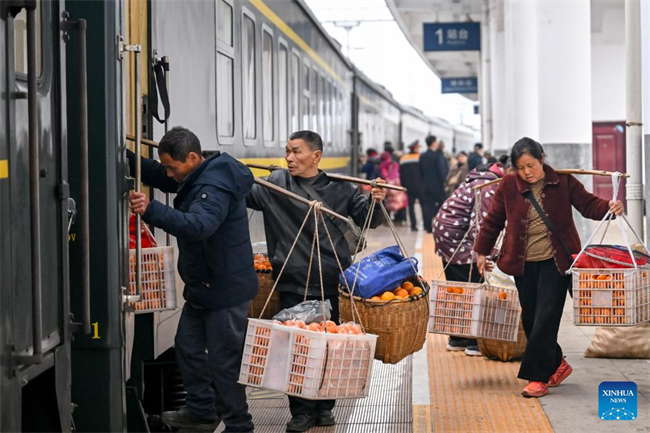 A farmer from Hunan Province carrying goods for sale prepare to leave the Tongren Railway Station in Tongren City, southwest China's Guizhou Province, Feb. 12, 2026.The train No. 7272/7271 has run across the mountainous areas in Hunan, Guizhou and Chongqing for almost 20 years. With an average speed of just 40 kilometers per hour, the train has made it easier for residents along the route to travel and commute, while also helping local products reach wider markets. (Photo by Yuan Fuhong/Xinhua)