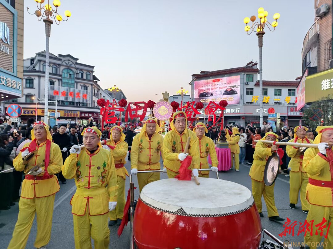 巡游结束后,迎春祈福民俗晚会在《金鼓迎春·赛马》的激昂鼓点中拉开帷幕,《观灯会》《鱼虾共舞》再现洞庭水乡风情,荷花村舞狮队与义南村、边山村六条巨龙同台献瑞,将气氛推向高潮。