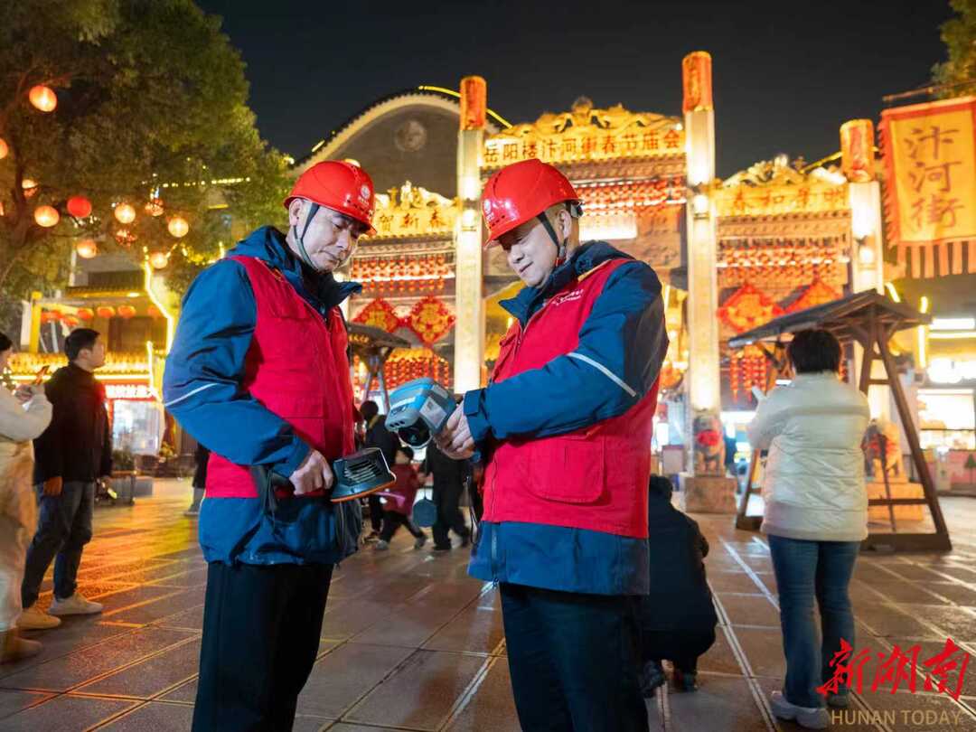 湖南日报·新湖南客户端2月21日讯(通讯员 辛若江 杨卓)红灯高挂映名楼,江风送暖年味浓。2月21日,大年初五,岳阳楼景区内依旧人头攒动,登高祈福、打卡赏景、体验民俗的游客络绎不绝,千年名楼的璀璨灯火与洞庭湖畔的湖光山色交相辉映,巴陵大地处处洋溢着团圆祥和的新春氛围。国网岳阳楼区供电公司的工作人员穿梭于景区街巷与周边商圈,为岳阳楼景区及周边春节期间安全稳定用电筑牢“生命线”。