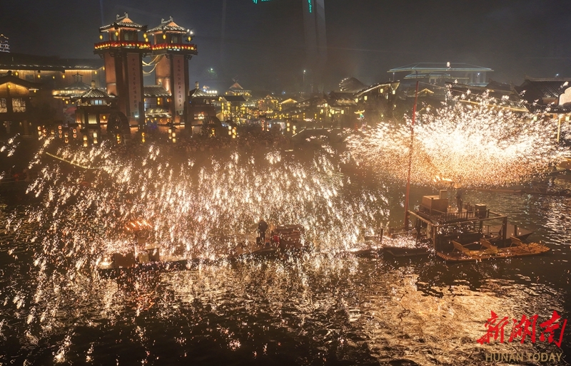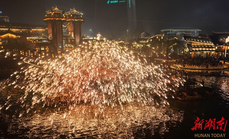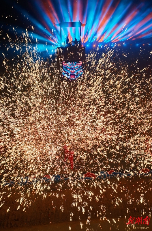 2月20日晚,衡阳市南岳区南岳里,民间艺人在表演打铁花。春节假期,该区举办丰富多彩的民俗活动,为游客带来了充满传统韵味的新春体验。曹正平 文兰 摄影报道(湖南图片库)