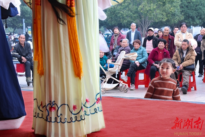 2月21日,临武县东塔公园,观众在观看县祁剧保护传承中心演员表演的祁剧《四仙姑下凡》。春节假期,该县文旅广体局开展“戏韵传乡愁 非遗贺新春”主题活动,通过祁剧、小调等展演,营造出喜庆祥和的节日氛围。陈卫平 摄(湖南图片库)