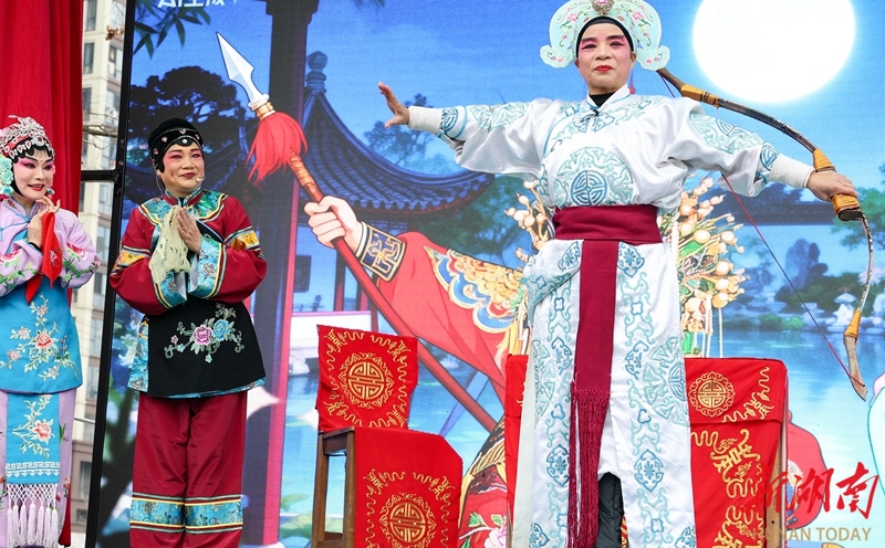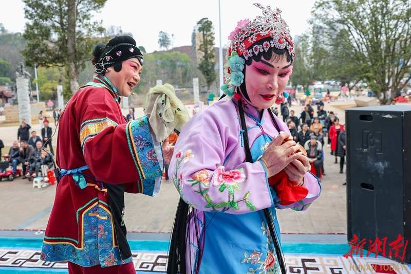 2月21日,临武县黄龙山植物公园,县祁剧保护传承中心演员在表演祁剧《开弓吃茶》。春节假期,该县文旅广体局开展“戏韵传乡愁 非遗贺新春”主题活动,通过祁剧、小调等展演,营造出喜庆祥和的节日氛围。陈卫平 摄(湖南图片库)