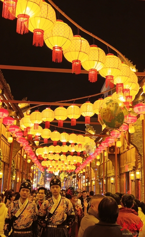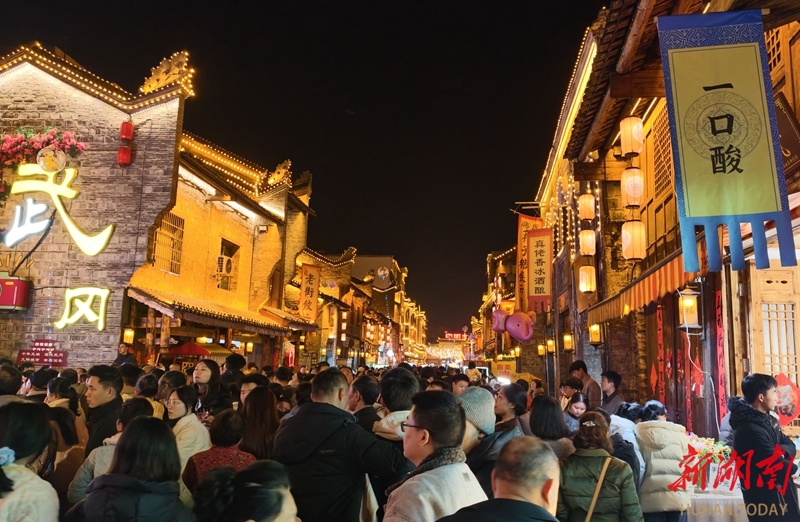 2月20日晚,武冈市西直街灯火璀璨,赏灯观景、品尝美食的游客络绎不绝,街巷间洋溢着浓郁的节日气息。 严钦龙 摄(湖南图片库)