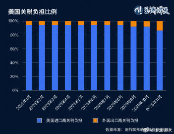 实际上,这些关税主要还是由美国企业和消费者在买单。根据美国纽约联邦储备银行的测算,2025年前11个月,在整体关税水平下,外国出口商负担的最大单月关税比例仅为14%左右,这意味着大部分关税都由美国进口商负担。