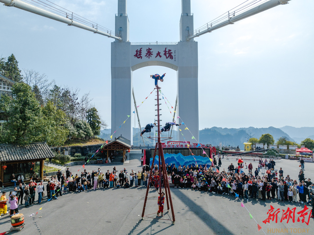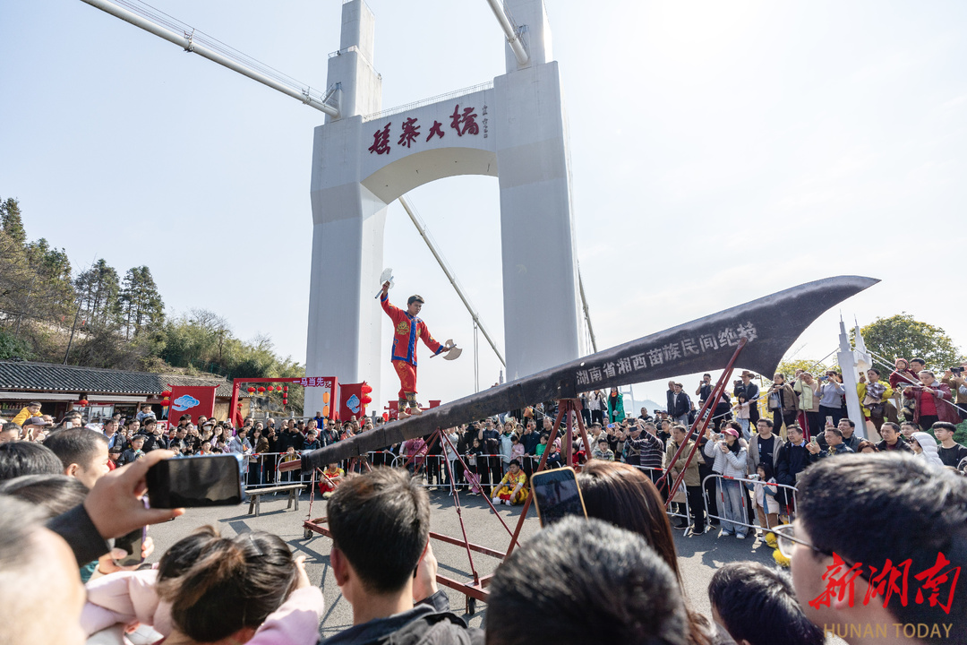 2月21日,吉首市矮寨大桥景区,游客在观看上刀梯表演。春节假期,该景区推出非遗展演、NPC互动游戏、新春送福等活动,让游客在喜庆氛围中欢度佳节。彭璟 摄(湖南图片库)