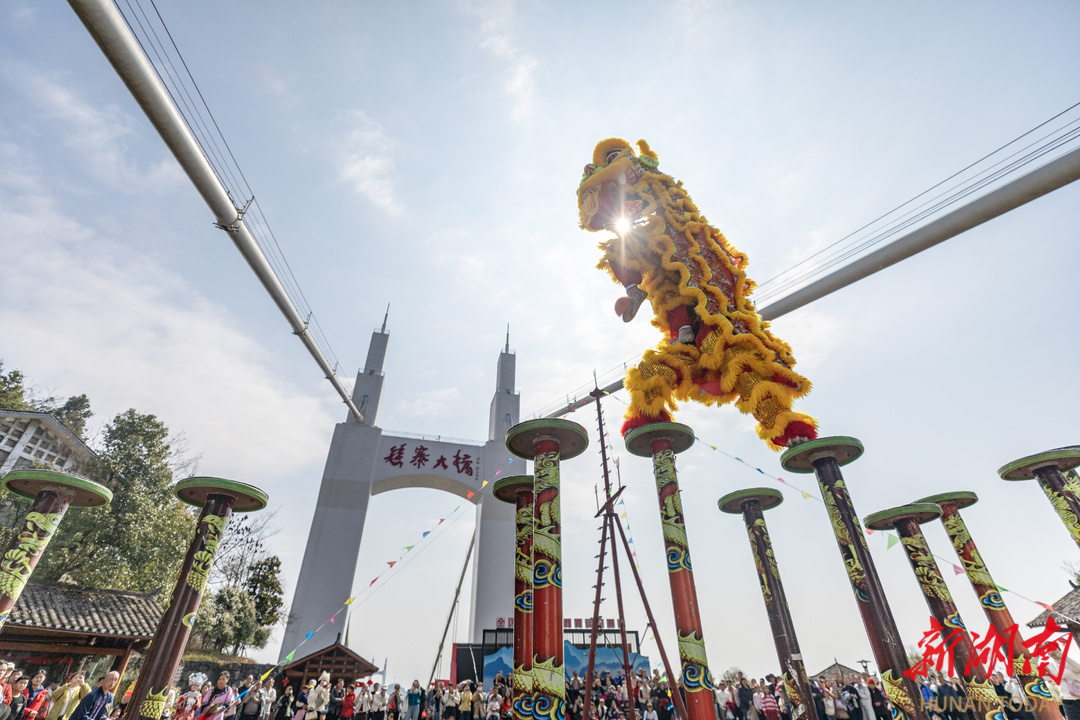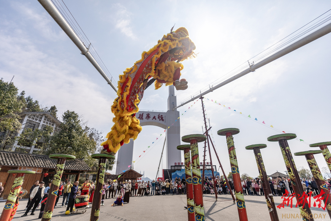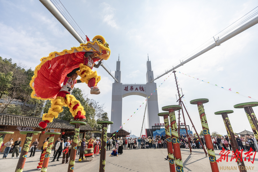 2月21日,吉首市矮寨大桥景区,游客在观看舞狮表演。春节假期,该景区推出非遗展演、NPC互动游戏、新春送福等活动,让游客在喜庆氛围中欢度佳节。彭璟 摄(湖南图片库)