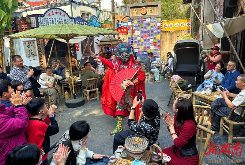 2月22日,正月初六,茶客们在长沙一处茶楼欣赏变脸表演。春节期间,当地多家茶楼推出“茶艺+演艺”模式,通过传统与现代融合的沉浸式体验,让消费者感受别样年味。湖南日报全媒体记者 徐行 摄