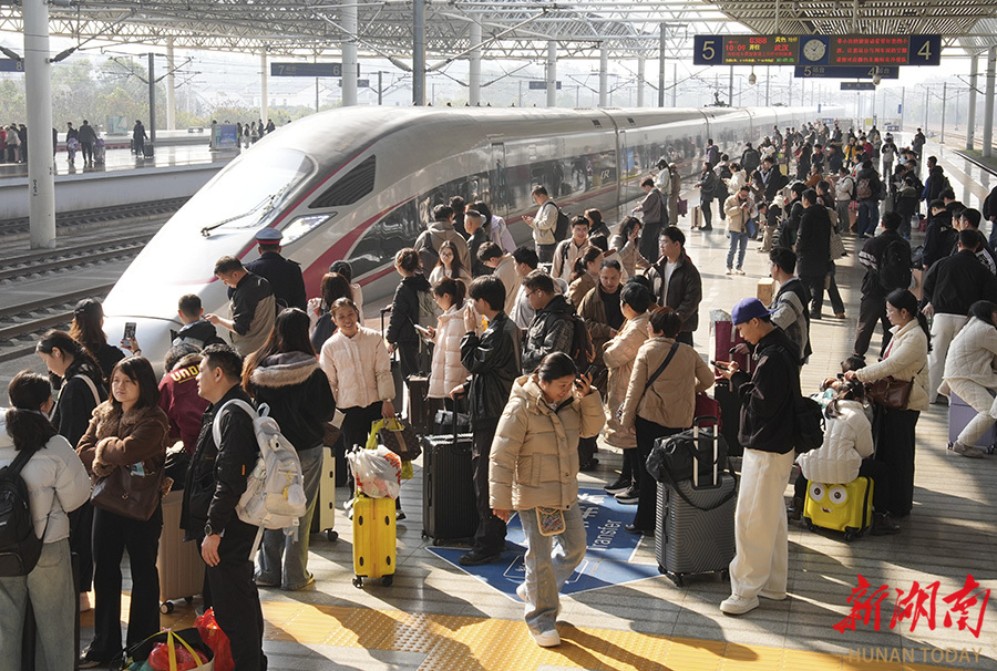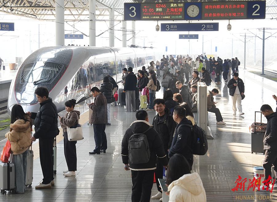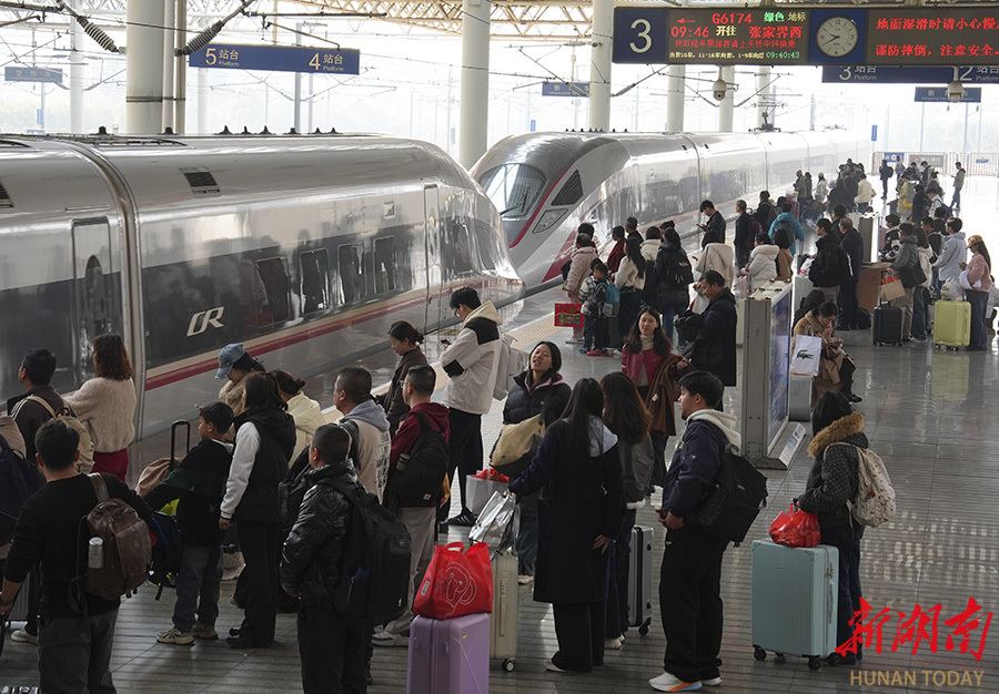 2月22日,衡阳东站,旅客有序排队乘车。当天是春节假期第八天,铁路迎来返程客流高峰。曹正平 谭贤 摄影报道(湖南图片库)