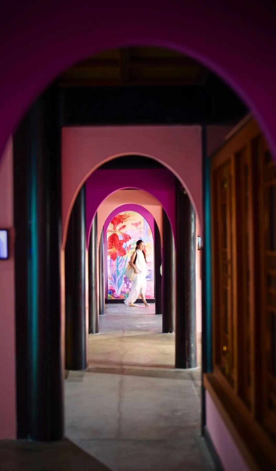 粉色背景墙与庭院光影