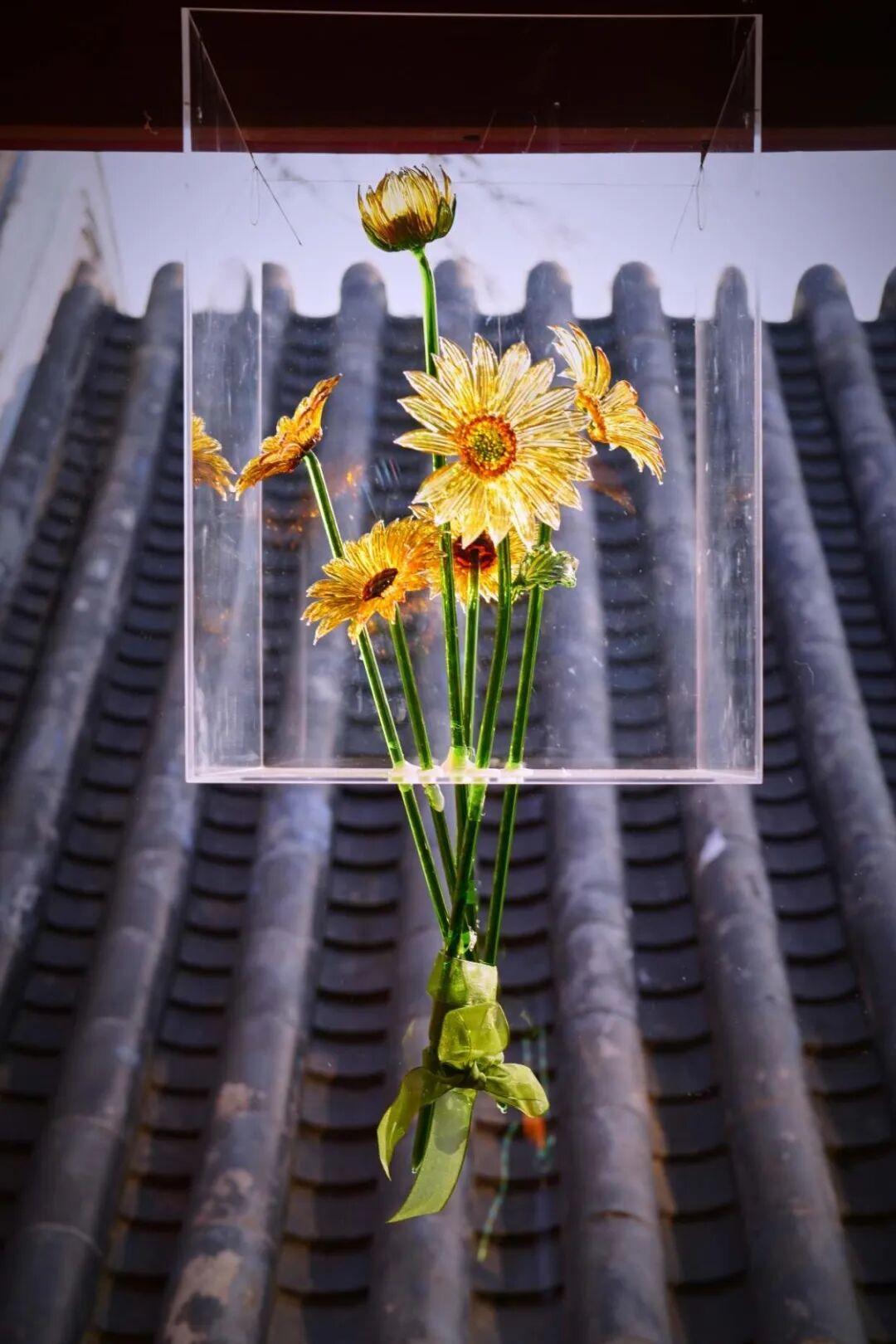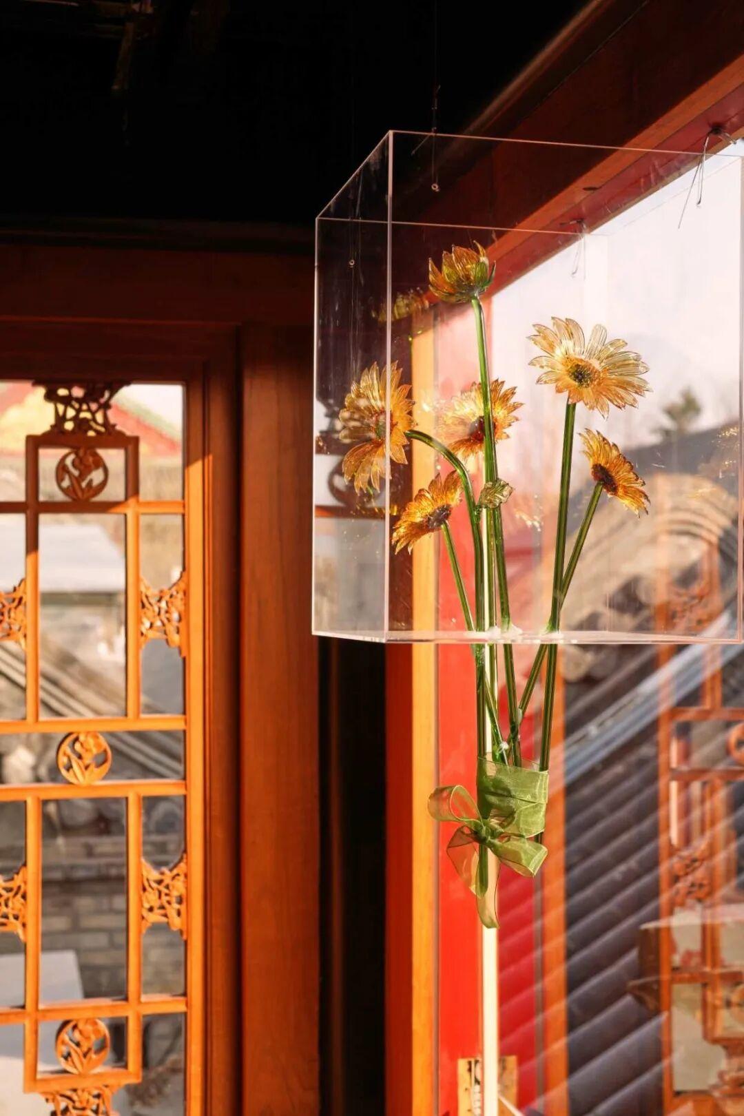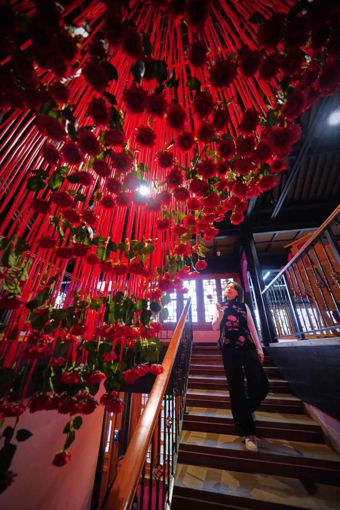 悬挂的花艺装置随光线流转生姿