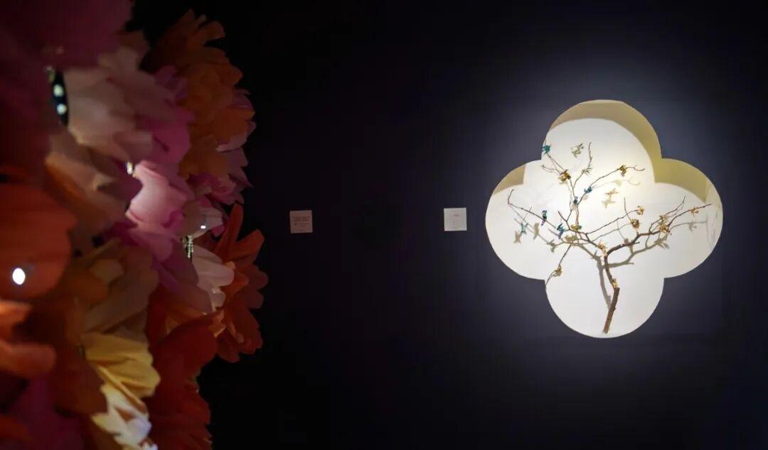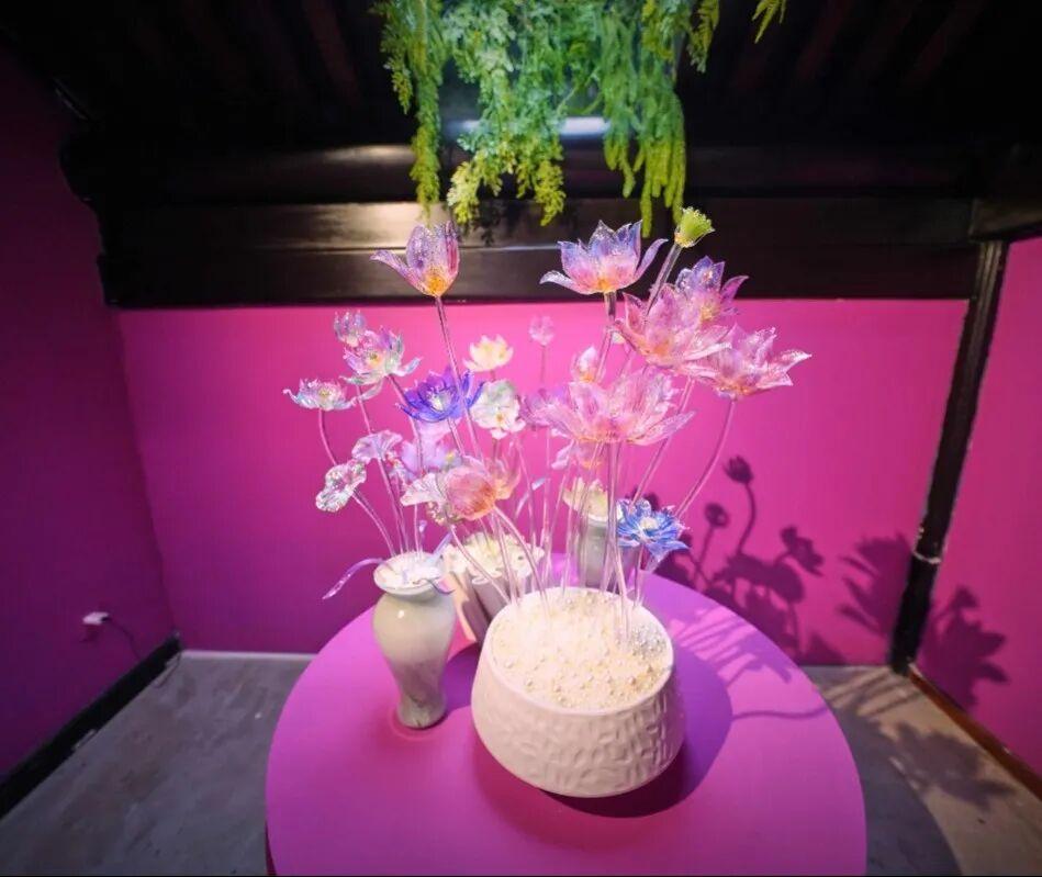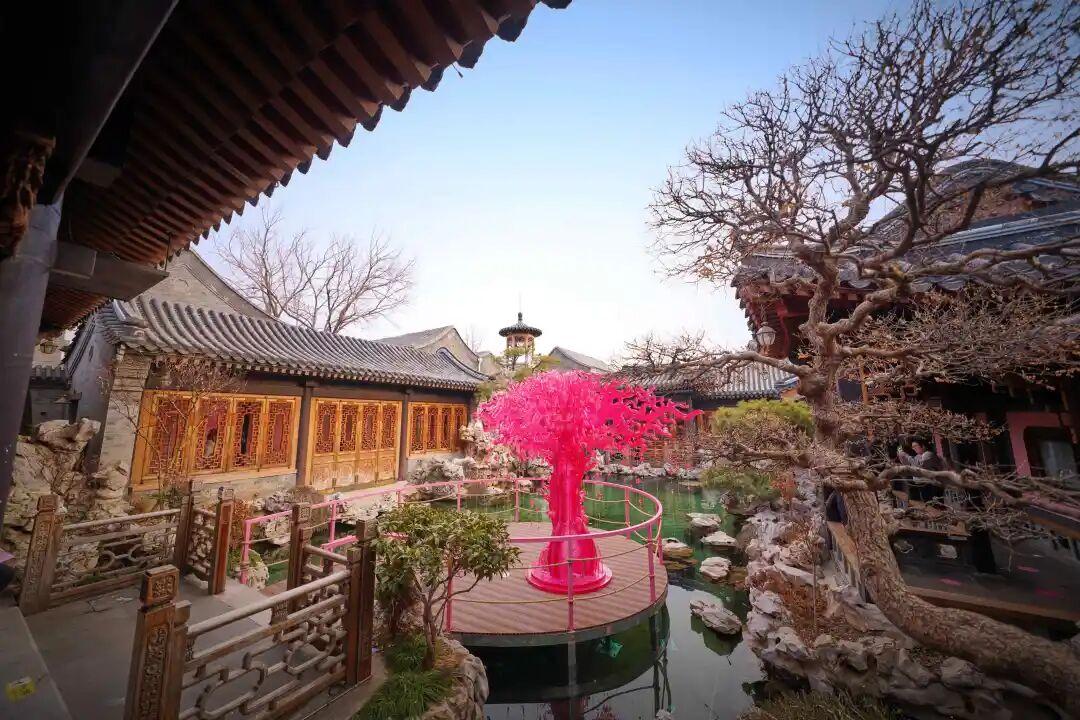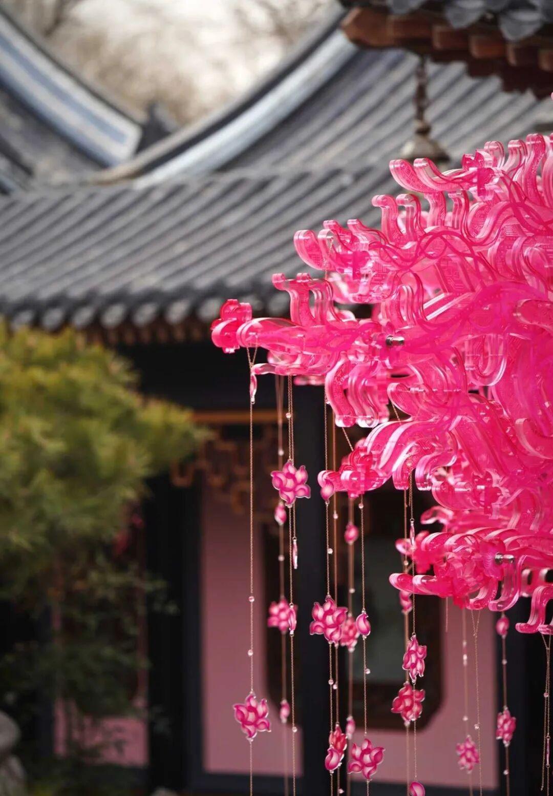 巨型亚克力桃花树立于清池之上