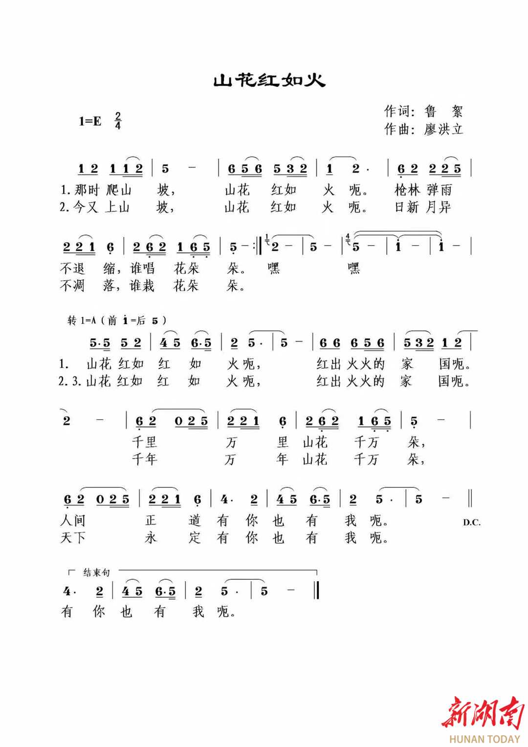 歌曲《山花红如火》,由湖南省示范性鲁絮政协委员工作室召集人、中国音乐文学学会理事鲁絮作词并联合策划,中国音乐家协会理事、湖南省音乐家协会驻会副主席廖洪立作曲,由张家界市委组织部、张家界市委党校(市行政学院)、永定区委宣传部、永定区湘鄂川黔革命根据地纪念馆出品,以红二方面军革命斗争为背景,以山花为喻,以红色为征,既象征着革命峥嵘之火,又象征发展建设之火,通过追溯先辈足迹、扎根红色热土,感怀革命先辈为了家国无恙、人民幸福而无惧牺牲的精神,展现了在中国共产党领导下新时代人民生活“红如火”、家国天下“永安定”的时光静好,此次参加南部战区陆军某旅“2026年迎新春联欢晚会”由中国社会艺术协会理事、张家界市和永定区两级鲁絮政协委员工作室住室文艺家、永定区湘鄂川黔革命根据地纪念馆红色文化志愿宣传员艾米演唱。