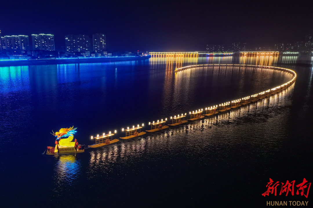 澧水河段之上,500米长的水上板板龙灯缀满炫彩LED灯光,沿水缓缓巡游,勾勒出“长龙卧波、光影映澧”的绝美景观,引得游客市民驻足观赏、打卡留念。