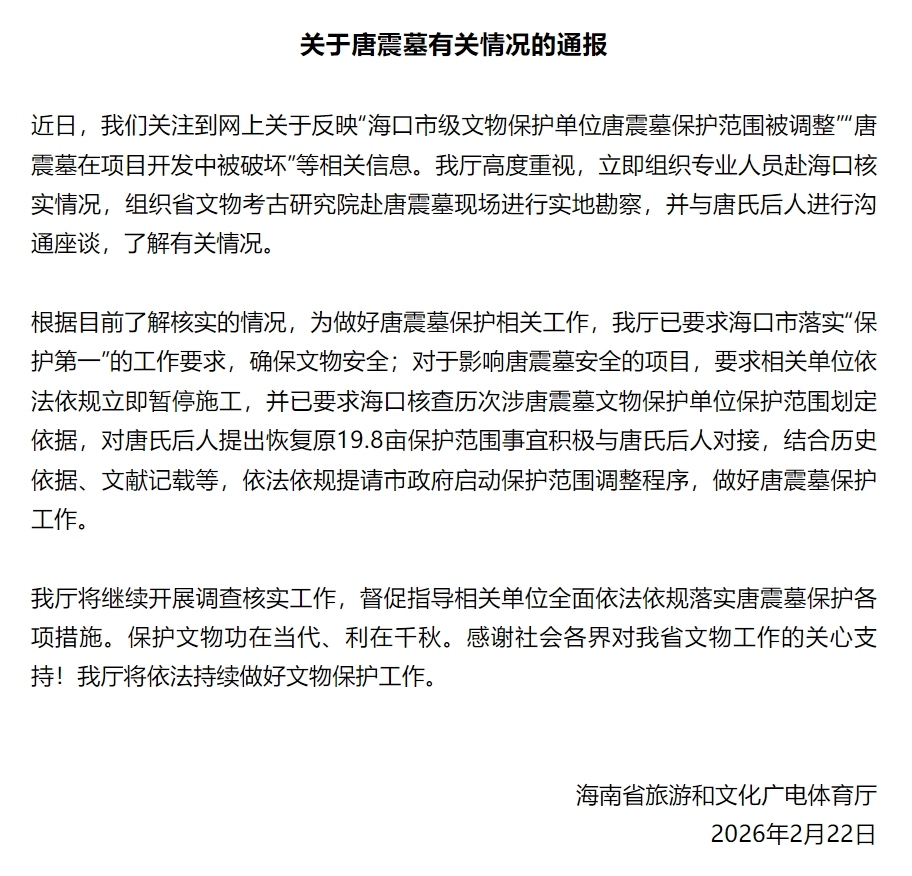 2月22日晚,海南省旅游和文化广电体育厅发布通报称,近日关注到网上关于反映“海口市级文物保护单位唐震墓保护范围被调整”“唐震墓在项目开发中被破坏”等相关信息。该厅高度重视,立即组织专业人员赴海口核实情况,组织省文物考古研究院赴唐震墓现场进行实地勘察,并与唐氏后人进行沟通座谈,了解有关情况。