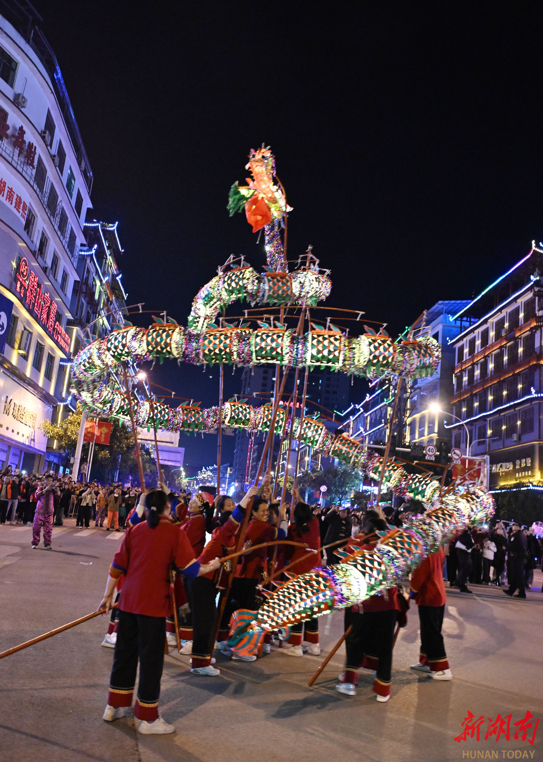 2月23日晚,城步苗族自治县举行龙狮巡游活动,来自丹口镇下团村的吊龙精彩亮相,吸引众多群众驻足观赏。严钦龙 摄(湖南图片库)
