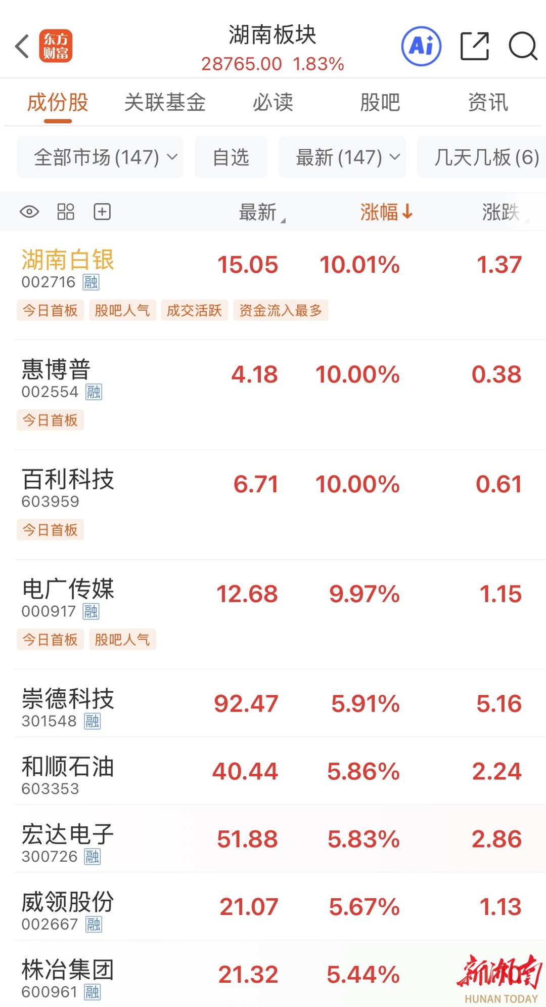 24日上午,部分湘股上涨情况