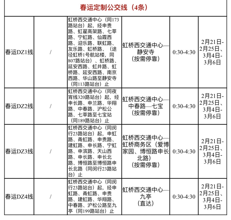 据了解,本次定制公交线路的开设,是管理部门基于2025年春运返程高峰虹桥枢纽0点至5点的客流热力分析的基础上开设的,共设置虹桥枢纽开往虹桥商务区、静安寺、七宝、九亭4个方向的定制线路,运营时间覆盖0:30至4:30的凌晨抵沪客流高峰时段。同时,考虑到返程旅客携带行李的出行需求,定制公交在确保安全的前提下,可按需停靠就近公交站点,最大程度方便市民出行‘最后一公里’。