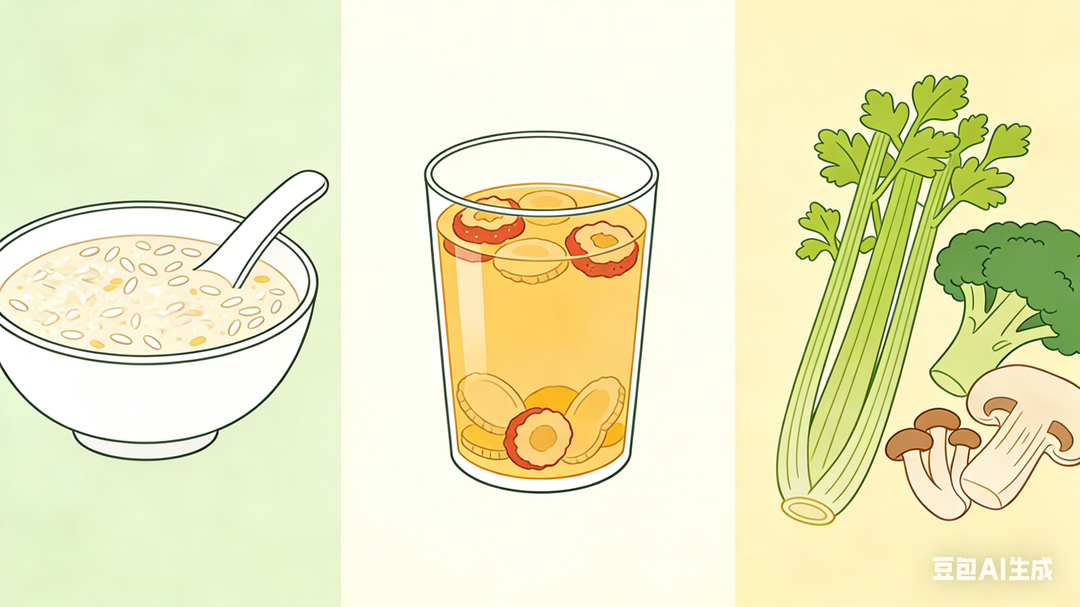 ▲饮食清淡:减少油腻食物,早餐可选择燕麦粥、小米山药粥,晚餐可喝白萝卜汤。