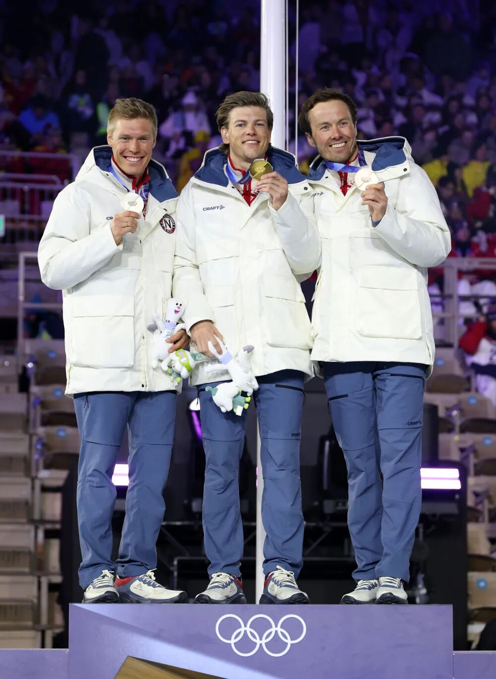 2月22日,越野滑雪男子50公里集体出发(传统技术)冠军挪威选手克莱博(中)、亚军挪威选手尼格特(左)和季军挪威选手伊韦尔森在闭幕式现场举行的颁奖仪式上。新华社记者 李明 摄“山顶的风景太好了!”