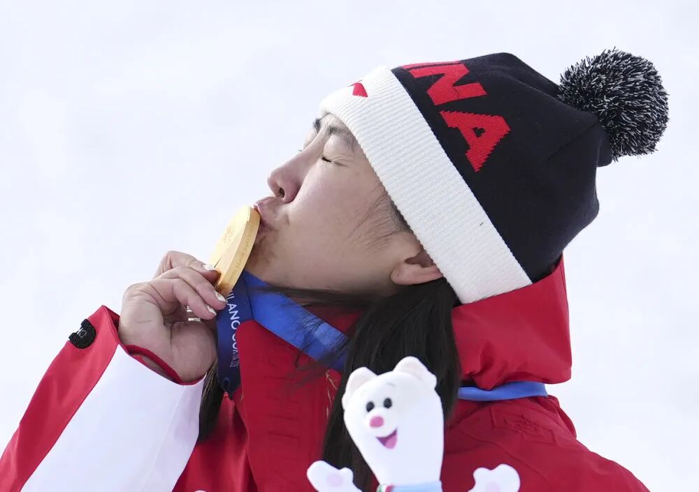 2月18日,中国选手徐梦桃在颁奖仪式上亲吻金牌。新华社记者 胡超 摄自信勇敢比金牌更可贵