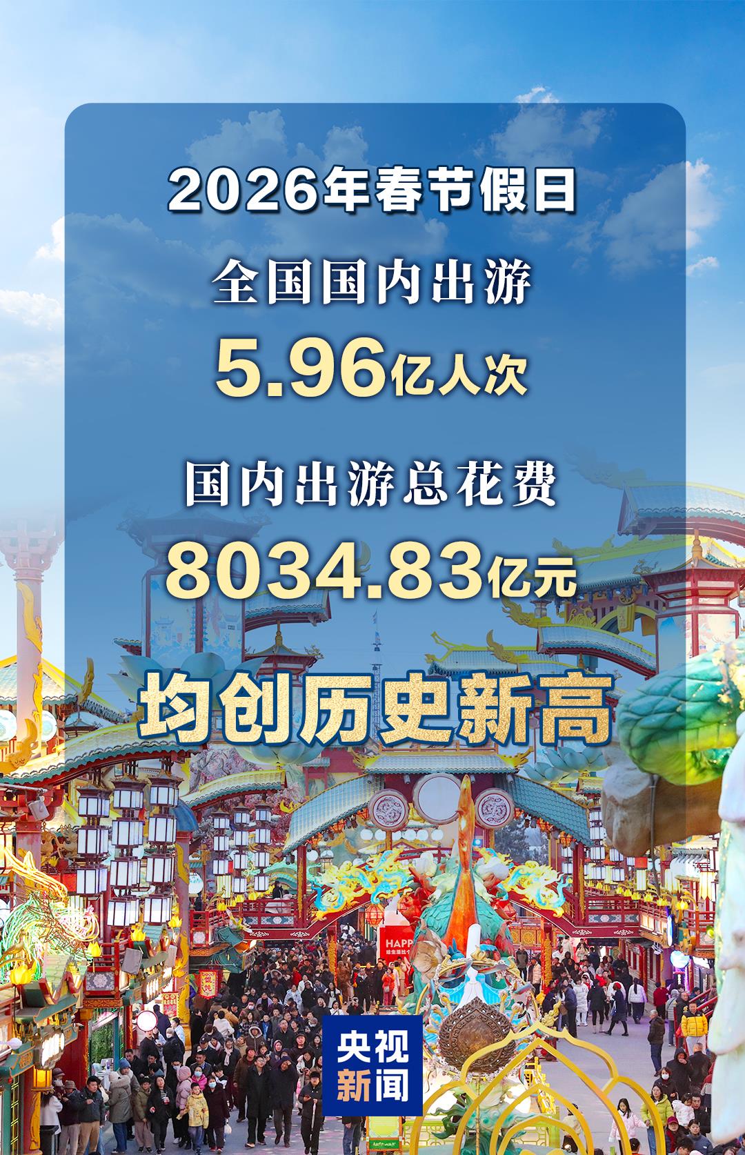 经文化和旅游部数据中心测算,春节假日9天,全国国内出游5.96亿人次,较2025年春节假日8天增加0.95亿人次;国内出游总花费8034.83亿元,较2025年春节假日8天增加1264.81亿元,假日游客人数和花费均创历史新高,全国文化和旅游市场平稳有序。