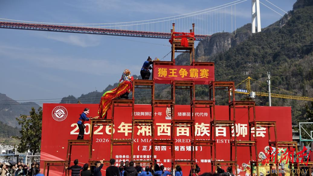2月20日正月初四,“湘西苗族百狮会”在矮寨镇大兴寨水库移民安置区精彩上演,52支队伍、近300匹“狮子”同台竞技,狮王争霸、登高献技,不仅吸引超2万群众游客围观参与,也让搬迁群众在家门口感受浓郁年味,温暖了苗乡人心。“现场的热闹带给我久违的年味,是我小时候能够看到的浓浓的年味,而且舞狮有带来吉祥的寓意。”来自湖南邵阳的游客唐春艳表示。