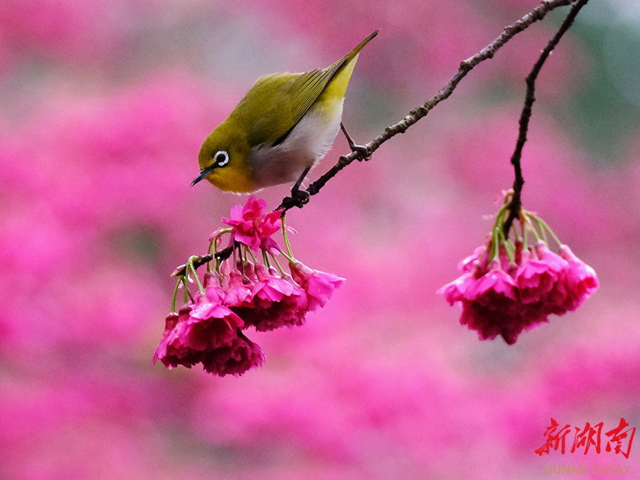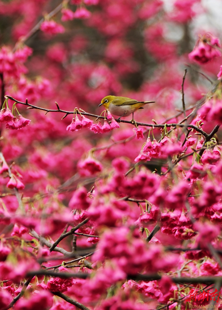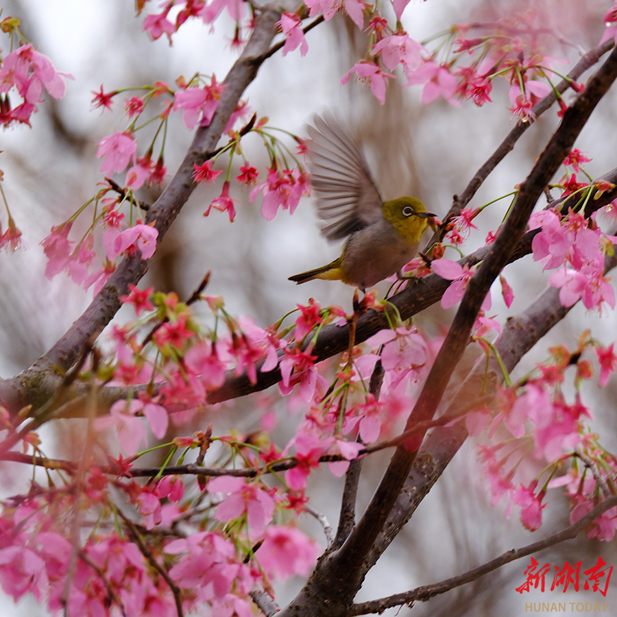 2月24日,湖南省植物园早樱初绽,引来小鸟在花间嬉戏觅食,呈现出一幅灵动的早春图景。 林道辉 摄(湖南图片库)