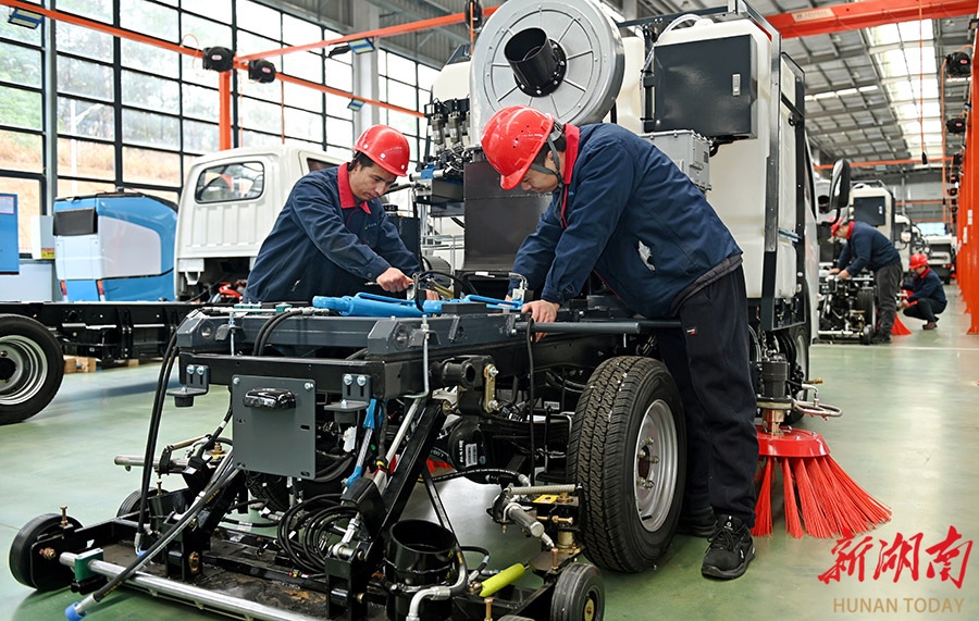 2月24日,洞口经开区纽恩驰(湖南)环境产业有限公司,工人在新能源环卫车生产线上进行装配作业。当天是春节假期结束后的第一个工作日,各地企业纷纷开工生产,力争“开门红”。 滕治中 摄(湖南图片库)