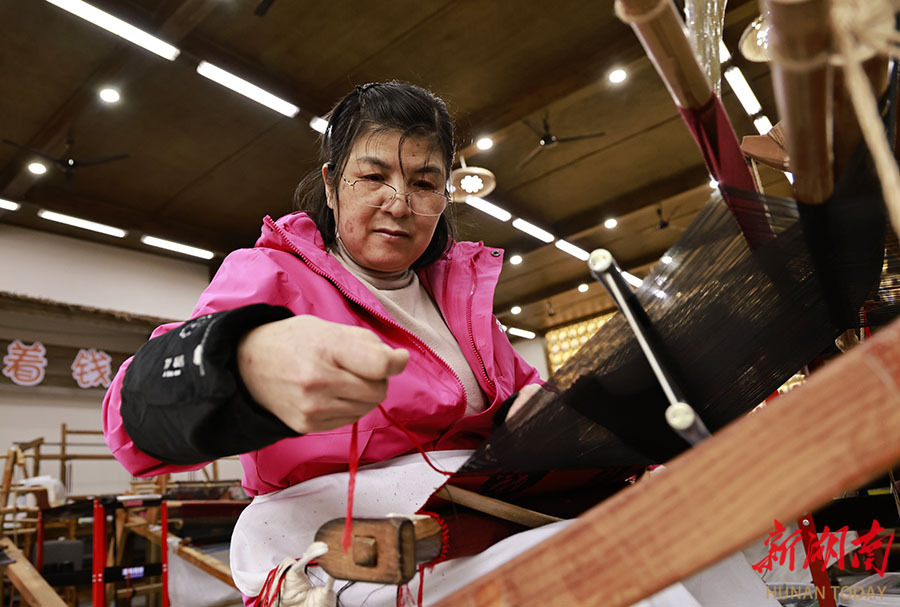 2月24日,张家界市武陵源区乖幺妹土家族织锦生产研发基地,工人在制作土家族织锦产品。当天是春节假期结束后的第一个工作日,各地企业纷纷开工生产,力争“开门红”。 吴勇兵 摄(湖南图片库)