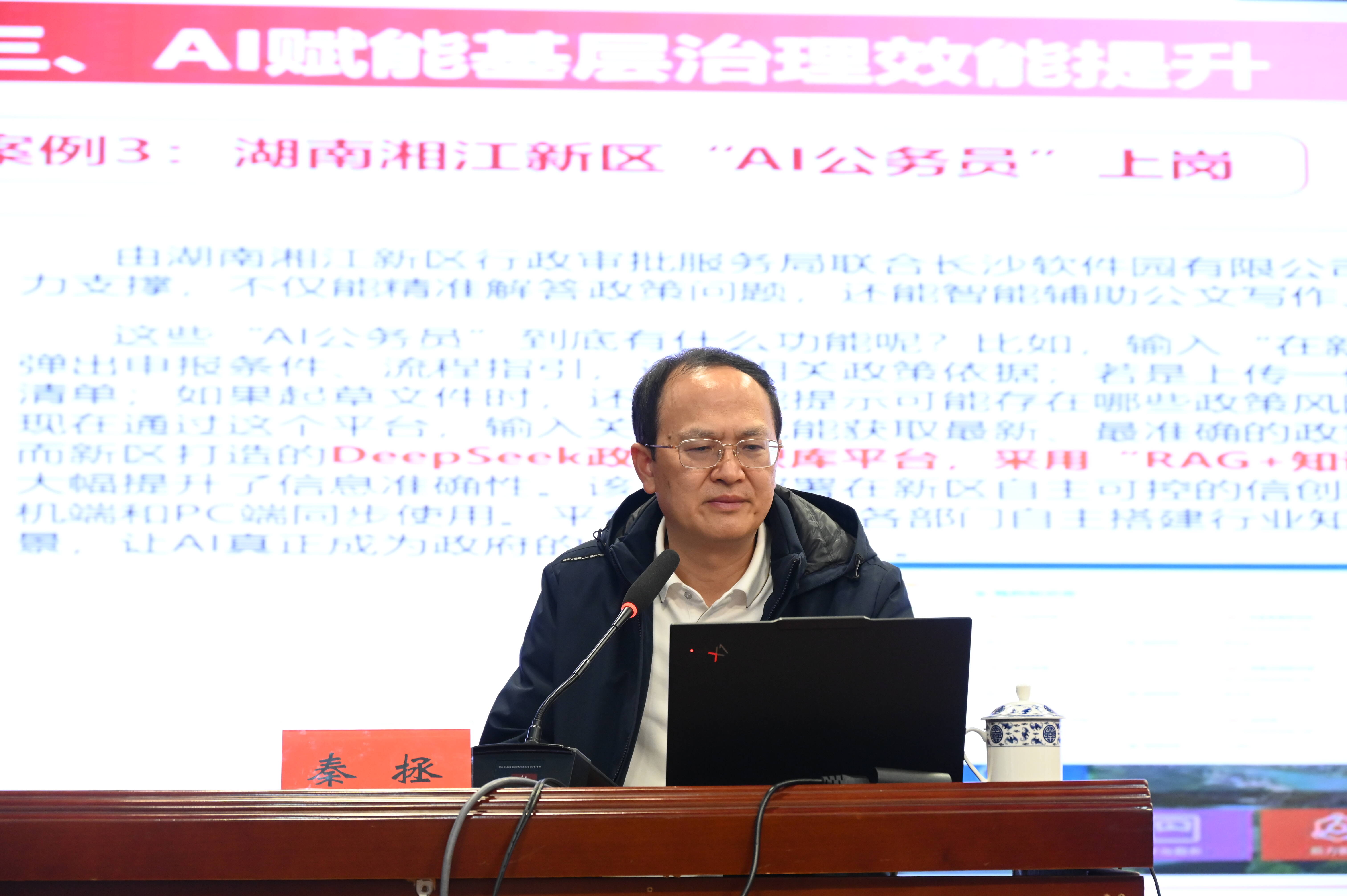 湖南大学大数据处理与行业应用研究中心(大数据研究与应用湖南省重点实验室)主任,信息科学与工程学院(网络空间安全学院)教授、博导秦拯以《人工智能(AI)的应用现状与未来展望——技术、工具与实践》为题,围绕AI兴起与爆发、AI大模型落地应用、AI现状与趋势等内容,结合人工智能变革演进和实践案例,系统阐述了AI运用的底层逻辑与应用实践,并就AI如何赋能新晃经济社会高质量发展提出工作建议。