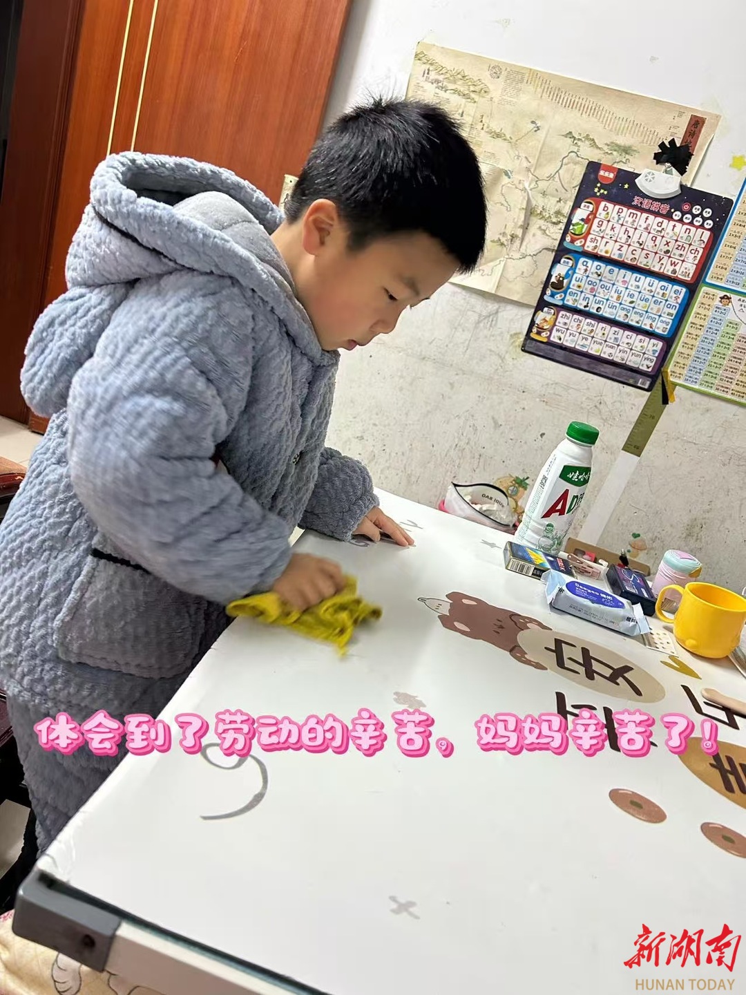 碗洗完了,妈妈说还要把桌子擦干净。我拿起抹布,把桌面上小小的垃圾都擦干净了。妈妈夸我做事很细心。我想对妈妈说:“您每天做家务,辛苦了!”