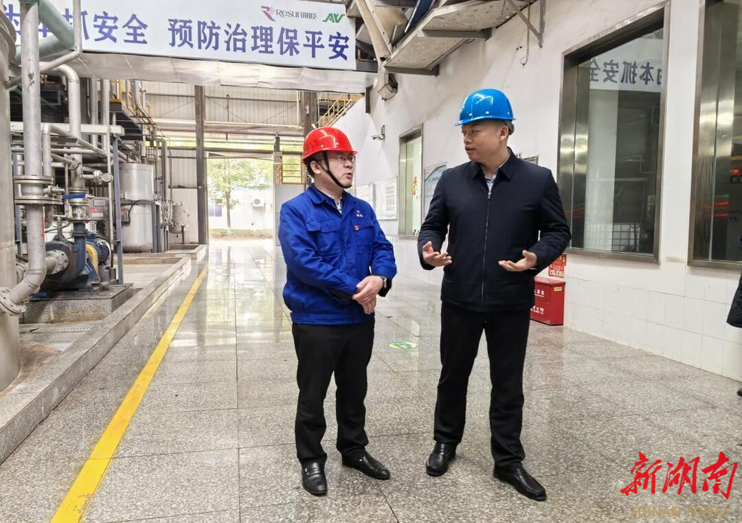 泉塘街道党工委书记田勇(右一)与公司副总经理张颖民在企业车间交谈。