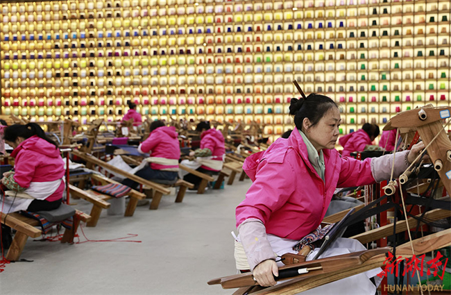 The photo, taken on February 24, shows workers busy crafting Tujia brocade products at the Guaiyaomei Tujia Brocade Cultural Creative Park in Wulingyuan District, Zhangjiajie City. That day marked the first working day after the Spring Festival holiday. Local enterprises resumed production, striving to get off to a good start. (Photo/Wu Yongbing)